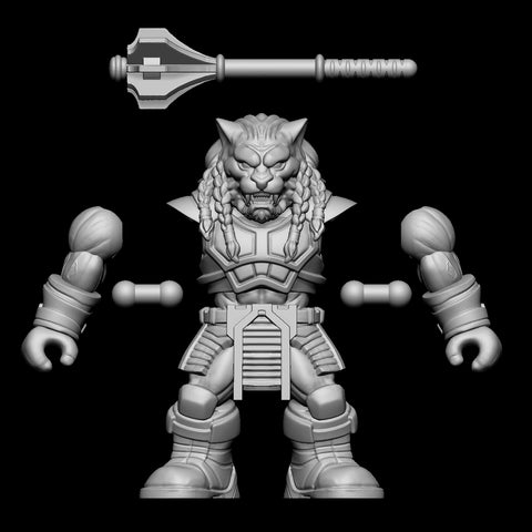 3D printed action figure with 4 points of articulation where the arms are attached to the torso by a barbell giving it the ability to rotate and swivel. This figure has the same proportions and size as the 1980's battle beasts. which it is heavily inspired by.
