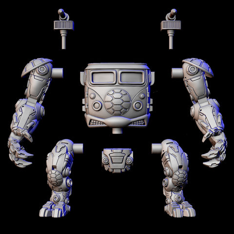 Mech- 3D printed action figure with vintage style 5 points of articulation where the arms and legs are attached by a cylindrical peg to the torso and waist that also swivels. This figure is a vehicle and can be used for the turtles and also other 1980's battle beasts and other small figures,
